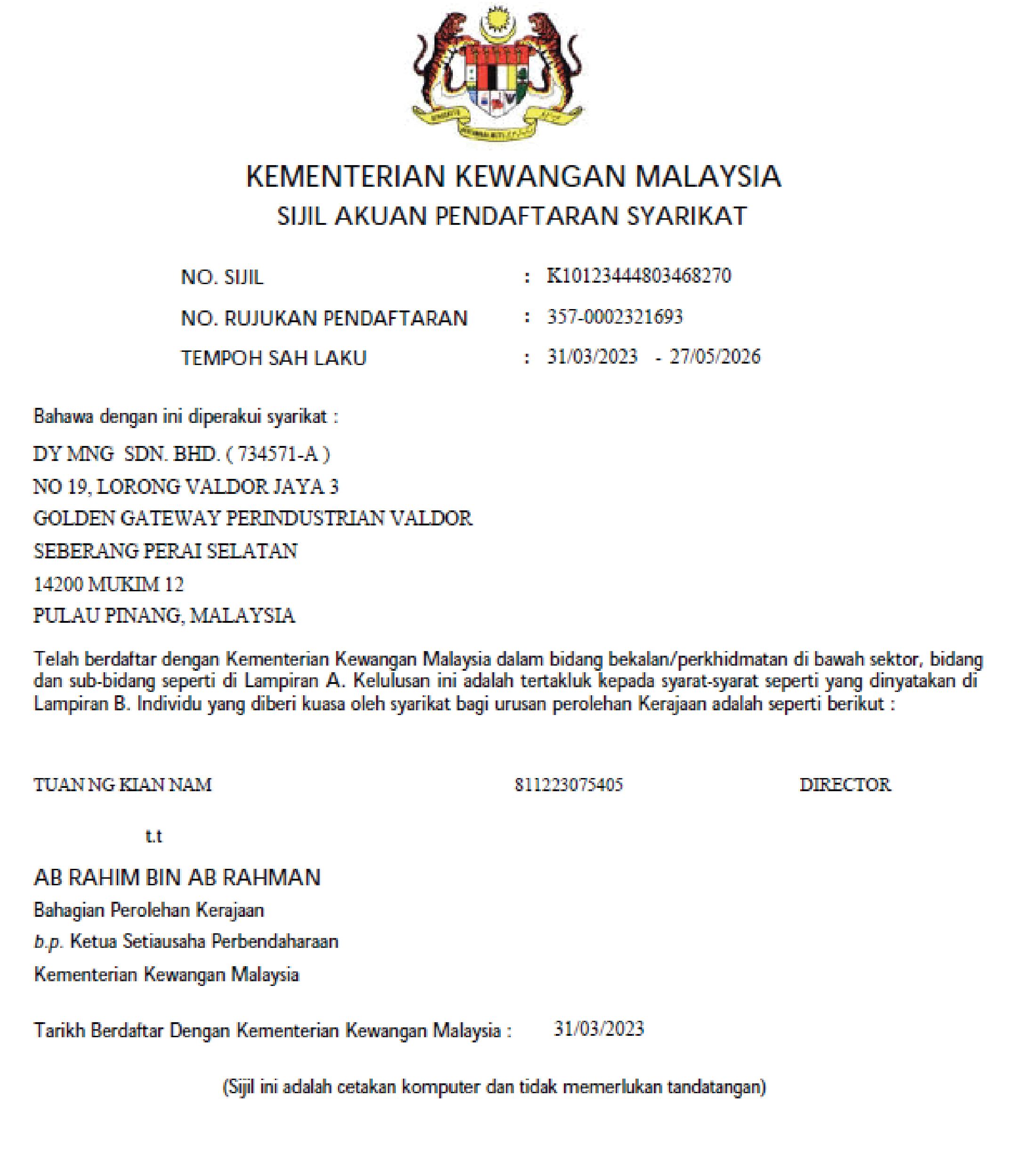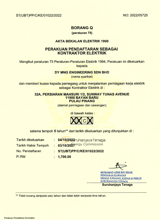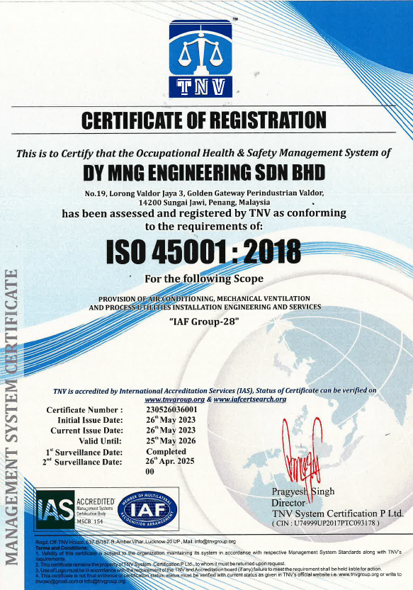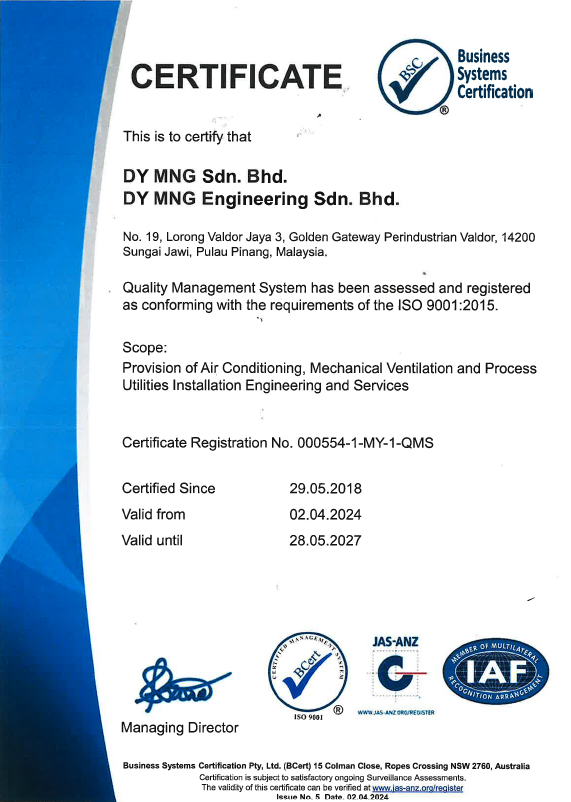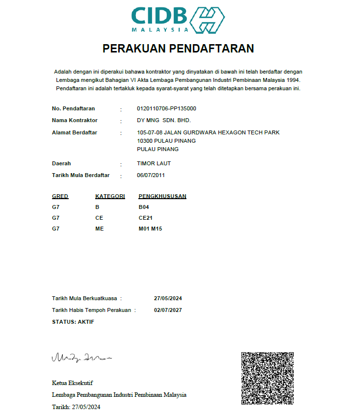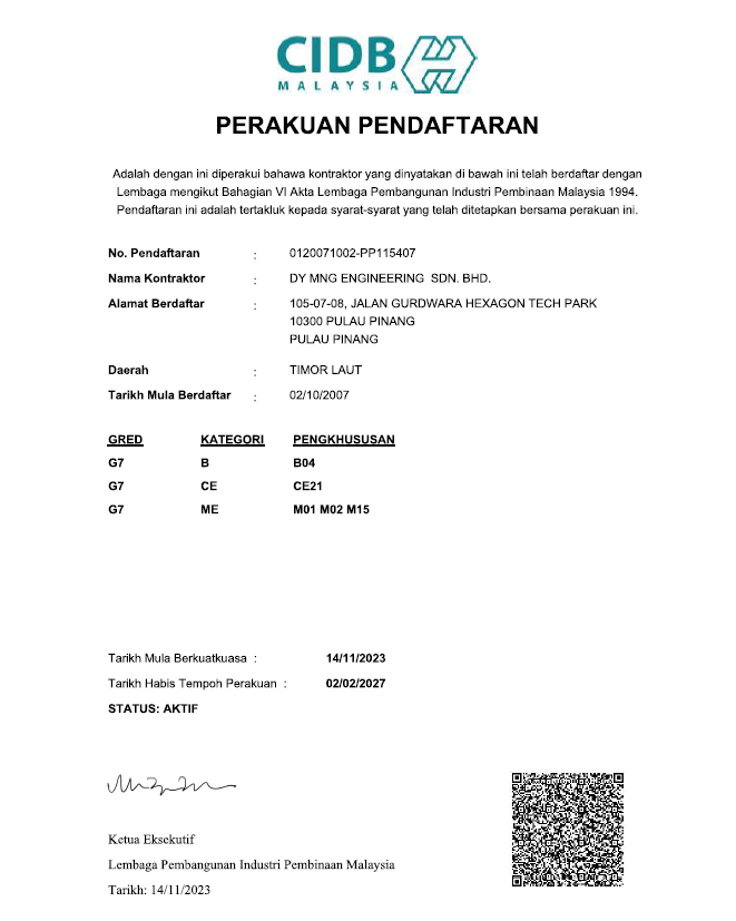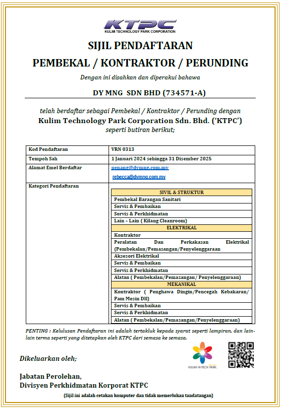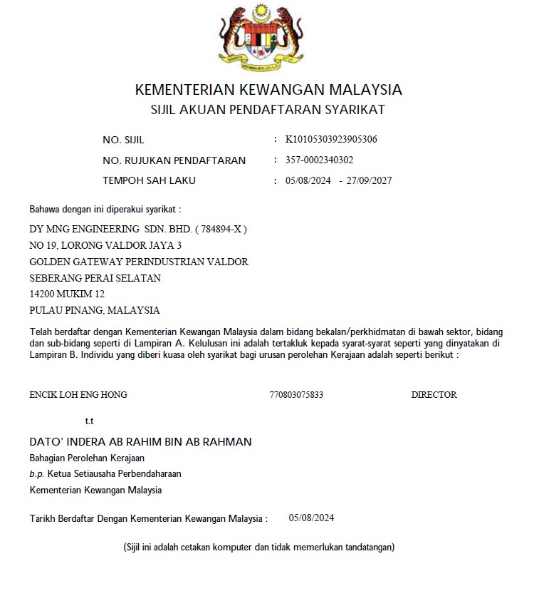 Certifications CertificationsDY MNGDY MNG Kementerian Kewangan Malaysia (MOF) Perakuan Pendaftaran Perakuan Pendaftaran ISO 45001:2018 ISO 14001:2015 ISO 9001:2015 ST (Class C) ST(UBT)PP/C/KE/01022/2022 Sijil Pendaftaran (KTPC)